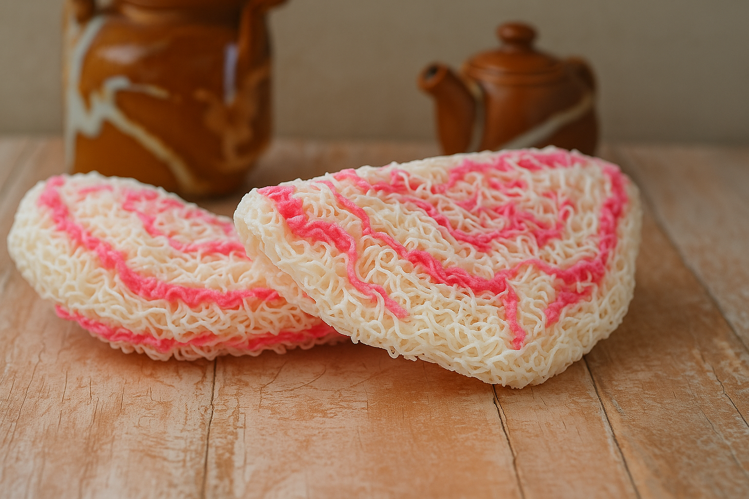 A true showstopper of the Avurudu table, Aasmee is a delicate and lacy Sri Lankan sweet made from a special blend of rice flour, coconut milk, and okra extract to create its signature airy texture. Deep-fried into beautiful net-like shapes and topped with a vibrant sugar syrup drizzle β usually pink or green β itβs light, crispy, and sweet all in one delightful bite.
